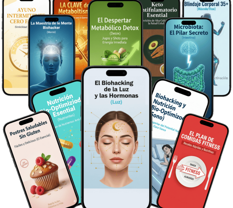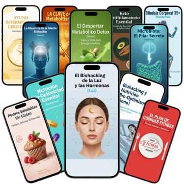 Recibirás una Biblioteca de Biohacking para la Vitalidad Máxima totalmente completa, compuesta por Guías Visuales de Ejecución, Protocolos de Cambio Rápido y Estrategias Bio-Optimizadas diseñadas para dominar tu energía, metabolismo y bienestar hormonal.